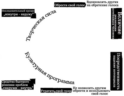 Путь к посредственности сковывает потенциал человека, тогда как путь к величию высвобождает этот потенциал и позволяет его реализовать. Путь к посредственности — это упрощенный подход к жизни, ориентированный на быстрые решения, а путь к величию — процесс последовательного развития «изнутри наружу». Тот, кто следует по нижнему пути к посредственности, живет по «культурной программе» себялюбия, потворства своим желаниям, ограничений, сравнения себя с другими, соперничества и виктимизму [14] . Тот же, кто идет по пути к величию, стоит выше негативных влияний культуры и делает выбор в пользу того, чтобы стать творцом своей жизни. Путь к величию можно выразить одним словом — «голос». Только тот, кто идет по этому пути, обретает свой голос и вдохновляет на обретение голоса других. Остальным величия никогда не достичь.