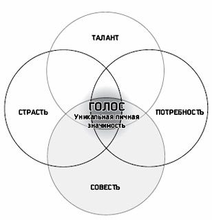 Как показано на рис. 1.2, голос находится на пересечении таланта (ваших врожденных дарований и достоинств), энтузиазма (того, что придает вам сил, стимулирует, мотивирует и вдохновляет), потребности (того, в чем окружающий мир нуждается настолько, что готов вам за это платить) и совести (тихого голоса, который говорит вам о том, что правильно, а что нет, и который побуждает вас к тем или иным действиям). Свой голос — свое предназначение, кодекс души — можно обрести, занимаясь той работой, которая раскрывает ваш талант и питает ваш энтузиазм, — работой, возникающей в связи с существованием в окружающем вас мире какой-либо великой потребности, к удовлетворению которой подталкивает вас ваша совесть.