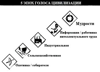 Чтобы понять основную проблему и глубокий смысл пророческого утверждения Друкера, мы должны вначале посмотреть на исторический контекст — а именно на пять эпох голоса цивилизации: во-первых, эпохи охотника/собирателя; во-вторых, сельскохозяйственной эпохи; в-третьих, индустриальной эпохи; в-четвертых, эпохи информации/интеллектуального работника; и, наконец, зарождающейся эпохи мудрости.