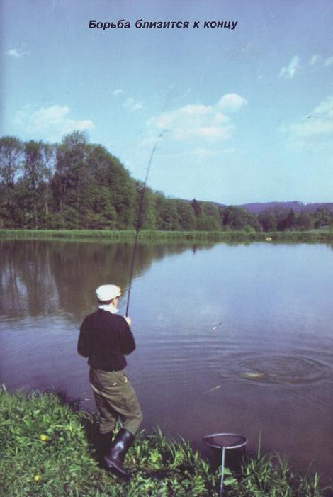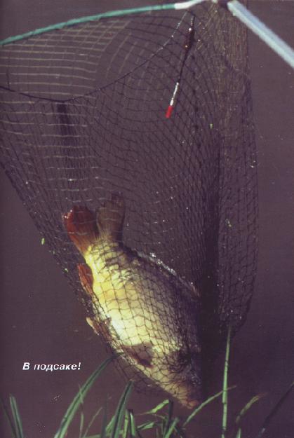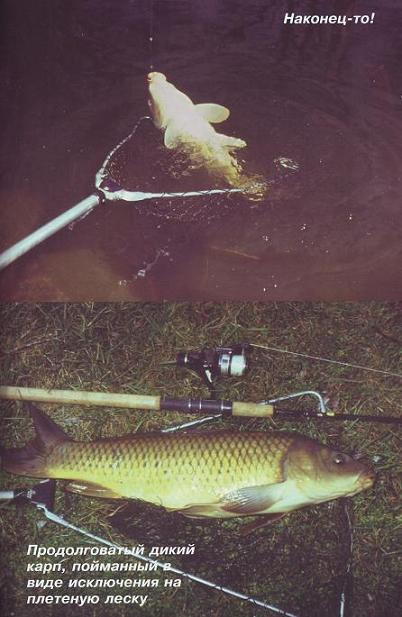 Для того, чтобы наполовину укоротить конический поводок и привязать к нему самую большую нимфу из тех, которые нашлись в наших коробках, потребовалось не более минуты. Карпы тем временем продолжают кормиться, освещаемые ласковыми лучами утреннего солнца. После осторожного заброса светло-зеленый плавающий шнур ложится несколько в стороне, и слабое течение медленно относит его в сторону карпов. Вот один из них поворачивается, конец шнура дергается — подсечка, мощный всплеск, треск катушки. Тоненькое форельное удилище гнется в дугу. Проходит несколько тревожных минут. И вот, наконец, карп в подсаке.