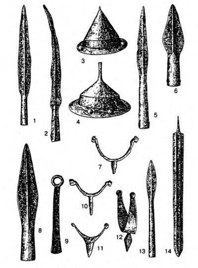 1, 2, 5, 6, 8, 13 — наконечники копий;