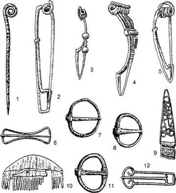 Из деталей одежды наиболее распространенными находками являются фибулы и поясные принадлежности (рис. 23). На ранней стадии пшеворской культуры господствовали фибулы позднелатенских типов. В римское время в употребление вошли профилированные фибулы, фибулы с высоким приемником, подвязные и арбалетовидные. Подобные фибулы не были специфической особенностью пшеворской или какой-либо иной культуры. Они были широко распространены на обширных пространствах Средней и Юго-Восточной Европы. Изготавливались фибулы в ремесленных мастерских и распространялись среди населения, принадлежащего к разных европейским этносам.