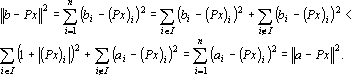 Из того, что a и b различны следует, что существует множество индексов, в которых координаты векторов a и b различны. Обозначим это множество через I = {i : ai = -bi}. Из второго преобразования в (5) и того, что b = x', следует, что знаки координат вектора Px всегда совпадают со знаками соответствующих координат вектора b. Учитывая различие знаков i-х координат векторов a и Px при i ∈ I можно записать |ai– (Px)i| = |ai|+|(Px)i| = 1+|(Px)i|. Совпадение знаков i-х координат векторов b и Px при i ∈ I позволяет записать следующее неравенство |bi– (Px)i| = ||bi|-|(Px)i| < 1+|(Px)i|. Сравним расстояния от вершин a и b до точки Px