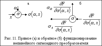 Обозначим входной сигнал через x, параметр через α, а вычисляемую этим преобразователем функцию через σ(α,x) (рис. 11а). При обратном функционировании на выход сигмоидного элемента подается сигнал ∂F/∂σ(α,x).