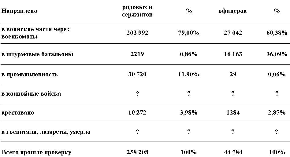 Таким образом, среди рядового и сержантского состава благополучно проходило проверку свыше 95 % (или 19 из каждых 20) бывших военнопленных. Несколько иначе обстояло дело с побывавшими в плену офицерами. Арестовывалось из них меньше 3 %, но зато с лета 1943 до осени 1944 года значительная доля (36 %) направлялась в штурмовые батальоны. Тем самым как бы предполагалось, что с офицера спрос больше, чем с рядового красноармейца.