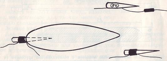 К примеру, поплавок, который изображен на рис. 12, весит 0,5 грамма, а его грузоподъемность 8,5 грамма. Вес стандартной оливки — 8,8 грамма. Для сравнения укажем, что перьевой поплавок весом 1,3 грамма удерживает в воде грузило весом лишь 2 грамма.