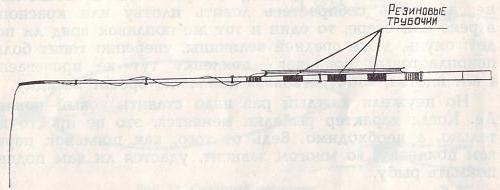 Чтобы не перевязывать каждый раз леску, когда нужно увеличить или уменьшить длину спуска, конец ее, до того как вы привяжете к нему крючок и поводки, пропустите через кусочек ниппельной или более прочной резинки длиною два сантиметра. Спустив леску с мотовилец на нужную вам глубину, закрепите ее резинкой, надетой на кончик удилища. Когда вы будете менять длину лески, резинку снимайте, так как леска может ее порезать, к тому же от трения не исключено повреждение и самой лески. Учтите и еще одно: если леску не обмотать вокруг удилища по спирали двумя-тремя витками, она при подсечке и вываживании рыбы будет провисать, резко изгибать кончик, вернее самую его вершинку.