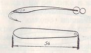 «Азарт». Конфигурацией напоминает «идеал», но меньше по размерам. Линии более плавные. Изготовляется точно, как «Идеал». Можно ставить один крючок с бородкой или два без бородок — (рис. 20). Наиболее приемлема для применения на окуня после ледостава. А вообще-то это преимущественно сиговая блесна. Для того чтобы «слышать», как она играет, надо применять леску не толще 0,3 миллиметра. Вес от 3–5 граммов с одним крючком, до 6 граммов — с двумя.