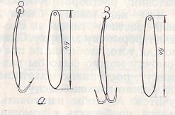 Можно было бы привести еще несколько образцов окуневых и сиговых блесен, но, думается, не стоит этого делать, как большое разнообразие блесен практически ничего не дает, но только отнимает время на их изготовление, а на рыбалке вносит сумятицу в поведение рыболова. При отсутствии поклевок рыболов без конца меняет свои блесны, между тем как бесклевье, как правило, имеет другие причины.