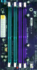 Согласно официальным спецификациям, северный мост i915G может работать и с DDR, и с DDR2, однако либо с той, либо c другой; одновременная разводка обоих типов памяти чипсетом, строго говоря, не предусматривается. Как инженеры Elitegroup обошли это ограничение я, честно говоря, не знаю (чтобы это выяснить, пришлось бы слишком глубоко зарыться в техническую документацию). Однако результатом их усилий стало то, что на 915G-A разведено по два слота памяти каждого типа, и материнская плата успешно с ними работает, причем даже не нужно переставлять какие-либо перемычки.