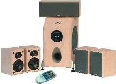Как в двухполосных сателлитах, так и в громкоговорителе центрального канала используются одинаковые головки: трехдюймовые широкополосные и 3/4-дюймовые высокочастотные. Судя по внешнему виду, диффузор широкополосной головки выполнен из полимерного материала, а купол пищалки - из шелка (что, разумеется, приятно, ведь даже в дорогих компьютерных колонках до сих пор встречаются убогие пластмассовые «высокочастотники»). В центрально канале установлены высокочастотный динамик и две широкополосные головки. Все громкоговорители магнитоэкранированы, так что их можно размещать в непосредственной близости от ЭЛТ-телевизора или ЭЛТ-монитора. Сердце акустической системы - сабвуфер: в нем установлен многоканальный усилитель, и именно через «саб» осуществляется управление комплектом. Акустическое оформление сабвуфера - фазоинверторное, причем труба фазоинвертора выведена на лицевую панель. В нем используется 6,5-дюймовая (165 мм) динамическая головка, выдающая вполне убедительный и «упругий» верхний и средний басы. Динамик размещен на боковой стенке, так что соседи снизу не будут жаловаться на «долбящий» им в потолок бас. В конструкции сабвуфера используются чисто аудиофильские «примочки»: в его нижнюю часть можно вкрутить регулируемые по высоте шипы, чтобы намертво закрепить ящик на полу, а для тех, кому дорог паркет, в комплект включены резиновые подставки, защищающие пол от острых шипов. На передней панели «саба» расположен электролюминесцентный дисплей, на который выводятся режимы работы системы, в частности отображается источник сигнала. Кроме того, при регулировке громкости и тембров на дисплейе высвечивается информация о настройке. Входы выполнены на стандартных разъемах RCA, а выходы на акустику - на зажимах. К системе можно одновременно подключить четыре источника, один из которых - пятиканальный и три - стереофонические. Коммутация входов производится через пульт дистанционного управления при помощи электронных коммутаторов - все как в бытовых усилителях или ресиверах.