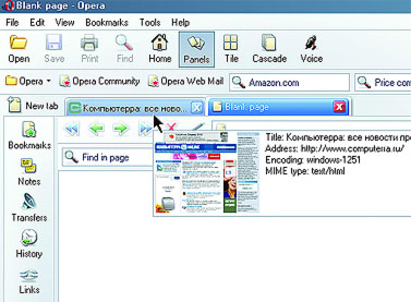 Табы в Opera 9 стали еще удобнее – теперь не нужно переключаться между ними для поиска какой-либо страницы. Достаточно лишь навести на заголовок вкладки курсор, и всплывет уменьшенная копия страницы – своего рода «скриншот» с аннотацией (рис. 2).