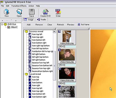 IphotoDVD создает из набора изображений слайд-шоу в формате MPEG, совместимом с DVD, SVCD и VCD. В утилиту включено множество эффектов смены кадров, а также средства предпросмотра. Она умеет накладывать звук, делать подписи к фотографиям и создавать меню диска. Для правки изображений имеется встроенный графический редактор.