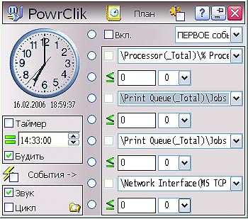 PowrClik Pro позволяет запускать программы и управлять питанием компьютера по таймеру или при наступлении какого-то события (например, уничтожение окна или повышенная загрузка процессора). Софтинка умеет управлять питанием компьютера и монитора, завершать сессию, производить блокировку, запрещать (или, напротив, форсировать) выключение компьютера или переход в ждущий режим. Управлять программой можно при помощи скриптов. Имеется также урезанная бесплатная версия PowrClik Lite.