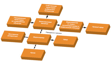 Главная проблема трансляции Олимпийских игр – нужно быстро создать в одном месте условия для работы сотен журналистов и десятков телекомпаний. Для этого за два года до начала Игр всем участникам соревнований и телекомпаниям, планирующим вести передачи, рассылается проект Международного вещательного центра (International Broadcasting Center, IBC). Все вещатели включают в проект свои пожелания и требования к площади помещений, подводке силовых и коммуникационных сетей, размещения редакций, студий, аппаратных и сопутствующего оборудования. Для обеспечения совместимости такого количества систем и чтобы не создавать помех друг другу, на Олимпиадах очень строго отслеживается и согласовывается применение любых радиоизлучающих устройств – радиомикрофонов, радиостанций, радиорелейных и спутниковых систем.