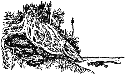 Тип первый — норы. Их роют, когда есть берега высокие и крепкие, в обрывах. Вход на глубине метра или двух под водой. Темное отверстие, в которое не возбраняется заплывать рыбам, — бобры их не тронут — наклонно направлено вверх. Поднявшись выше уровня реки, нора ведет куда-нибудь под корни крепкого дерева. Там мрачноватая спальня, иногда такая большая, что двое людей, если им придет в голову такая фантазия, вполне могут в ней ночевать. Если река ненадежная и вода в ней в сухое время убывает, то под первым входом по направлению к спальне копается другая нора. Вход должен быть под водой — это непременное условие. Иногда "крыша" над спальней, слой земли, не выдерживает, проваливается. Тогда сверху наваливают кучу хвороста.