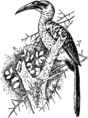 Токо — самые маленькие из птиц-носорогов. Кормятся они насекомыми. Когда дети токо немного подрастут, отец, летая с каждым насекомым в клюве, не поспевает вдоволь наловить добычи. Словом, долго свою семью один содержать не может. Поэтому его самка вынуждена недели через две-три после рождения птенцов покинуть уютное заточение и помогать отцу кормить птенцов. Когда она и он взломают прочную стенку, закрывающую вход в гнездо, и самка вылезет из него, первым делом родители спешат принести детям глину, и те сами себя вновь замуровывают, чтобы в безопасности досидеть ещё две недели, оставшиеся до вылета из гнезда.