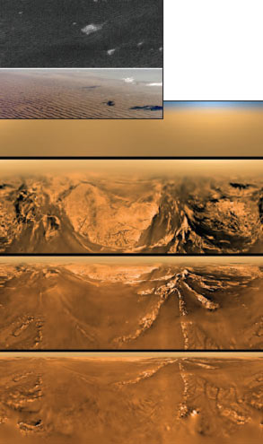 Похоже, астрономам придется подкорректировать идею о широком распространении метановых озер на Титане. Принятые за жидкость темные участки поверхности в экваториальной области оказались зонами, покрытыми песчаными дюнами стометровой высоты и тысячекилометровой длины (на верхнем фото показаны «титанические» дюны за компанию с земными, на нижнем – изображения, сделанные на разных высотах при посадке зонда «Гюйгенс»).