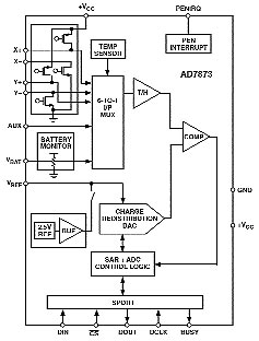 Для разных типов резистивных матриц сегодня выпускается достаточное количество специализированных контроллеров (даже тип разъема и порядок разводки сигналов самой матрицы вполне устоялся, хоть и не принят как стандарт). Коммутация шин производится ключами на полевых транзисторах. Преобразованием и оцифровкой сигналов занимается 4—6-канальный АЦП (обычно интегрирующий, на основе таймера, порядка 12 бит разрешения, с быстродействием около 100 тысяч отсчетов в секунду); «лишние» каналы заняты измерением опорного напряжения и температуры, сильно влияющих на точность. Кроме того, контроллер содержит и один из вариантов последовательного интерфейса (больших скоростей передачи здесь не требуется, так что начиналось все с RS-232, а в последнее время применяется SPI или USB). Для примера привожу структурную схему контроллера AD7873 от Analog Devices.