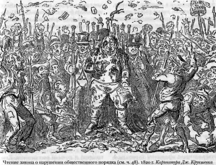 1826 г. характеризуется страшной нищетой и новыми восстаниями. Едва закончилась шестимесячная стачка 1825 г. в Брэдфорде, в Йоркшире, где бастовало не менее двадцати тысяч человек, как в следующем, 1826 г. в том же Брэдфорде вспыхнуло восстание, вызванное введением новых механических ткацких станков и закончившееся междоусобным столкновением рабочих, В результате которого были убитые и много раненых. Стачка текстильщиков и углекопов Ланкашира в 1826 г. была жестоко подавлена войсками. Правда, уже следующий, 1827 г. (год, когда начались похождения членов-корреспондентов Пиквикского клуба) внес некоторое умиротворение в экономическую жизнь Англии, но зато ознаменовался тремя кабинетными кризисами (впрочем, два из них были вызваны не политической борьбой, а смертью премьеров: графа Ливерпуля и Каннинга).