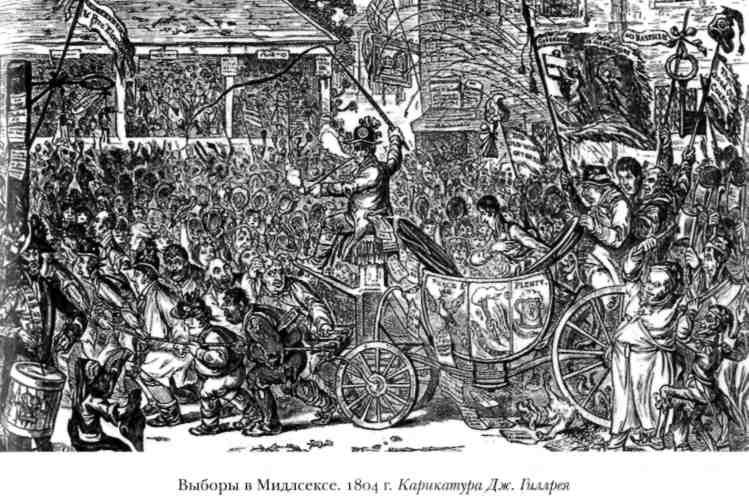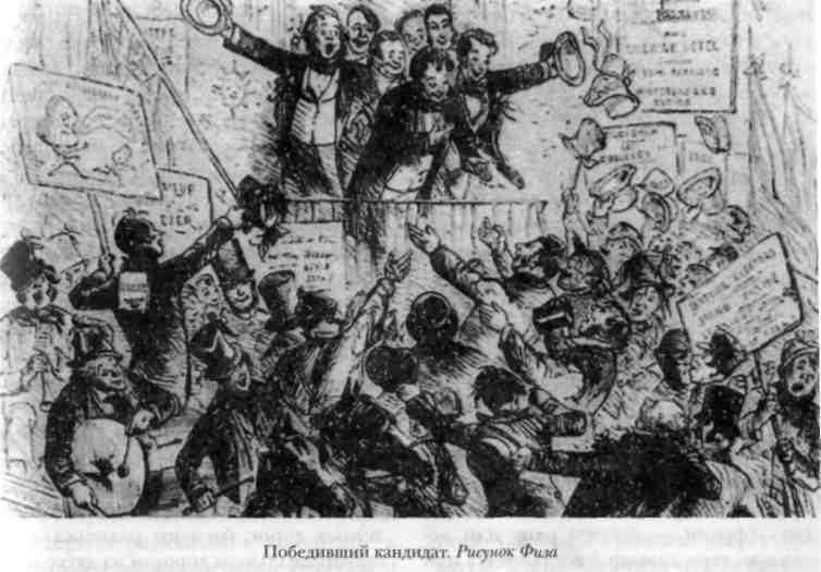 Что касается самой процедуры выборов, то до реформы 1832 г., несколько ее упорядочившей, она не была повсюду единообразной. Диккенс описывает типическую картину выборов, и в пояснение к его изложению можно прибавить не много. Началом процедуры считался тот момент, когда специально уполномоченное лицо, комиссар по выборам (returning officer), в городах — мэр, в графствах — шериф, получало королевский приказ о производстве выборов. К назначенному дню сооружалась специальная трибуна, «платформа», на которой кандидаты выстаивали по нескольку часов, в течение иногда нескольких дней подряд, тщетно пытаясь произнести речь в свою пользу или против кандидата враждебной партии перед толпой, прерывавшей оратора не только криками, шумом и шутками, как было в Итенсуилле, но также метанием в него комьев грязи, камней и дохлых кошек. Вообще городская толпа представляла немалую опасность для кандидатов, так что им приходилось нанимать специальную охрану, вооруженную дубинками и сопровождавшую их самих и избирателей. В счете, который подавался кандидату его агентом после выборов, в особой графе значилось приблизительно следующее: «На содержание трехсот человек, поддерживавших порядок во время речей, — 460 фунтов». Как видно, между прочим, из описания Диккенса, простым способом поддержания порядка было затыкание рта противнику.