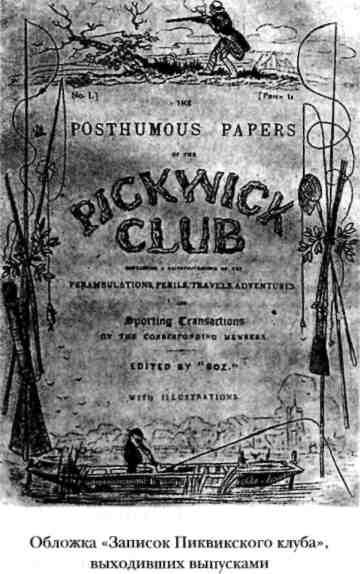 В газете «Тайме» от 26 марта 1836 г. было помещено объявление, извещавшее, что 31 марта выйдет в свет первый выпуск, ценою в один шиллинг, «Посмертных записок Пиквикского клуба, издаваемых Бозом». Полное заглавие, напечатанное на светло-зеленой обложке, гласило: «Посмертные записки Пиквикского клуба, содержащие правдивый отчет об изысканиях, опасных предприятиях, путешествиях, приключениях и охотничьих похождениях членов Общества корреспондентов, под редакцией “Боза”». Титул был заключен в рамку, составленную из принадлежностей ружейной и рыболовной охоты, а также из изображений мистера Пиквика, заснувшего в лодке над удочкою, леска которой натянута до крайнего напряжения, и мистера Уинкля, только что срезавшего сухой древесный сук выстрелом из ружья. Оба эти эпизода в «Посмертных записках» отсутствуют, но характерные черты, сообщенные художником обоим членам клуба, сохраняются в описаниях Диккенса, повторяются последующими иллюстраторами, так что рисованные фигурки становятся типами и воспринимаются почти как портретные изображения. Издание выходило ежемесячными выпусками и было закончено в октябре 1837 г. девятнадцатым и двадцатым выпусками. Первые выпуски не сразу завоевали симпатии читателя, — только что вышедшие отдельным изданием «Очерки Боза» пользовались большей популярностью. Однако еще до выхода в свет шестого выпуска (август 1836 г.; в пятом выпуске появляется Сэм Уэллер) Диккенс подписывает договор с другим издательством на «Оливера Твиста», который выходит также выпусками с января 1837 г. одновременно со второй частью «Пиквика». Последний все больше покоряет читателей, круг которых растет с поразительной быстротой. Первый выпуск был сброшюрован и пущен в продажу в количестве четырехсот экземпляров, пятнадцатый выпуск был послан в брошюровочную сразу в количестве сорока тысяч экземпляров. Насколько продуктивно мог работать Диккенс, можно судить по тому, что в том же 1836 г. он успел написать еще три, хотя и незначительных, произведения в драматической форме.