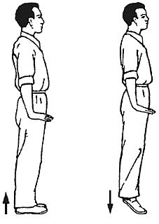 Сначала из исходного положения выгибаем ладони в запястьях так, чтобы пальцы были направлены вперед, центры ладоней вниз. Одновременно надавливая руками вниз, переносим вес тела на передние части стоп, стараясь приподнять как можно выше пятки над поверхностью. Затем, расслабив тело и руки, возвращаемся в исходное положение. Когда вы переносите вес тела на носки, создайте следующее образное представление: вас сверху как будто медленно поднимают за макушку, привязывая к небу, и одновременно снизу плавно подталкивают под ягодицы. Вы должны почувствовать, как вдоль позвоночного столба циркулирует та энергия, которая заставляет вас выпрямиться.