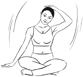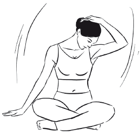 Согните левую руку в локтевом суставе и расположите ладонь на правой стороне головы. Мягко надавливая ладонью, наклоните голову влево. Почувствуйте растяжение мышц шеи. Задержитесь в этом положении на 10–12 счетов.