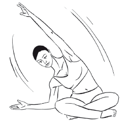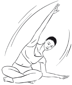 Сохраняя прямое положение спины, потянитесь правой рукой вверх и в сторону так, чтобы почувствовать растяжение боковых мышц туловища. Задержитесь в этом положении на 10–12 счетов.