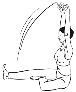 Сядьте прямо, правая нога вытянута вперед, стопа максимально оттянута на себя, левая нога согнута в колене, стопа прижата к внутренней поверхности правого бедра. Руки вытянуты вверх над головой. Из этого положения максимально выпрямите позвоночник вверх, потянувшись за руками. Плечи не поднимать. Задержитесь в этом положении на несколько счетов.