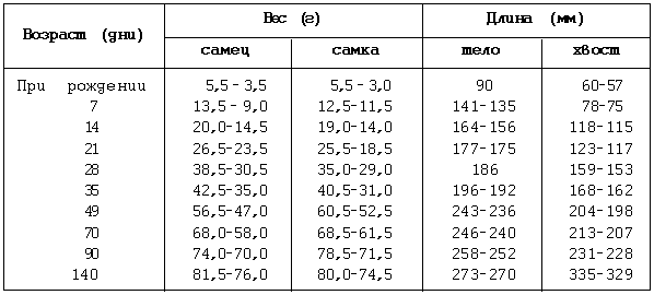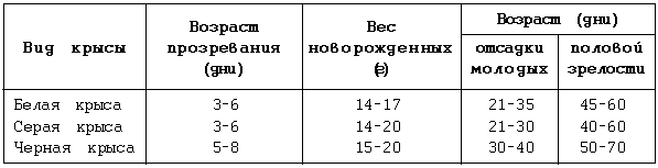 Как уже говорилось, крысы дают до 5–6 пометов в год. Вес новорожденного зверька достигает 3–6 г в зависимости от количества особей в помете. Детеныши крыс растут и развиваются несколько медленнее хомячков, однако они довольно подвижны еще до открытия глаз, что происходит на 14–17-й день, а к 10-дневному возрасту у детенышей появляются нижние резцы. Полного развития молодые особи достигают через месяц, в это время их уже можно поселить отдельно (табл. 9, 10).