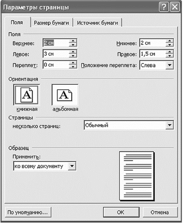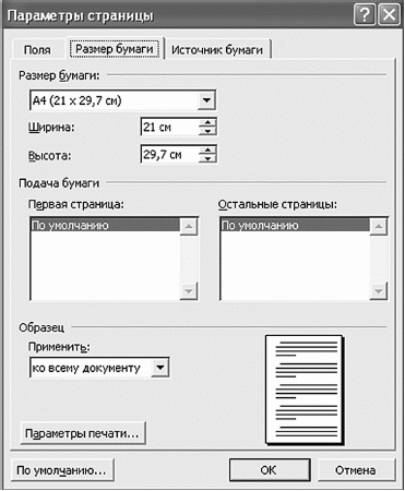В этом окне можно задать нужные поля (заметьте, их не нужно рисовать от руки, как в тетрадках) и ориентацию страницы (книжная или альбомная – посмотрите на картинку в окне).Если вы используете обычные листы формата А4 (это обычные листы, которые в пачках лежат в бухгалтерии, на которых вы пишете курсовые), лучше установить параметры для этого размера бумаги. Ну а если у вас необычный формат листа, вы можете самостоятельно выбрать ширину и высоту листа. Вы спросите – зачем? Для того, чтобы, когда вы выведете на печать свое произведение искусства, не получилось так, что на лист влезает только половина текста.