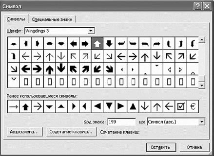 Окно вставки символов