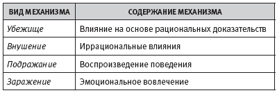 1. Личное влияние. Соответствующую группу методов иногда называют «техниками личной работы». Эти методы основаны на действии четырех классических механизмов психологического воздействия (табл. 5.3.1).