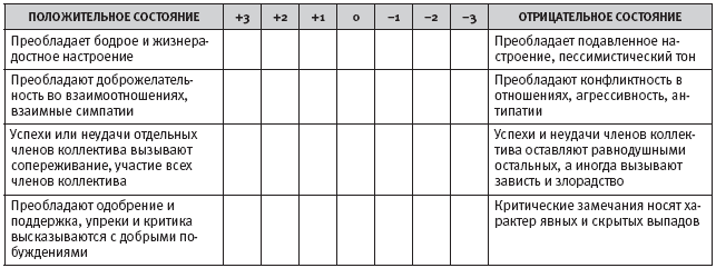 Опросник представляет собой семибалльную шкалу, вмонтированную в набор качеств, характеризующих эмоциональные отношения в группе. Наблюдатель-эксперт оценивает уровень развития отдельных групповых качеств следующим образом: крайние значения «+3» и «–3» ставятся тогда, когда качество очень сильно и постоянно проявляется, «+2» и «–2» качество постоянно, но не так сильно, «+1» и «–1», когда качество проявляется крайне редко и слабо. Соответственно, модальность знака означает принадлежность признака к правому – благоприятному или к левому – неблагоприятному – состоянию качества. Балл «0» означает, что наблюдатель затрудняется. При обработке полученных результатов следует избегать соблазна точной статистической обработки, поскольку измерительные возможности данного метода довольно ограниченны. Однако, подвергая полученный эмпирический материал содержательному анализу, можно выявить опасные состояния, которые иногда скрыты от руководителей, занятых своей основной деятельностью и не имеющих времени или компетенции «разбираться» с психологическим климатом.