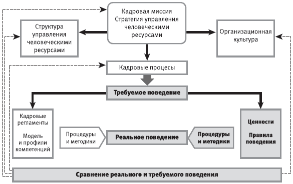 Формирование организационной культуры в формате управления человеческими ресурсами (рис. 5.4.1) выражается в том, что постановка всех компонентов системы управления человеческими ресурсами должна учитывать (как барьер или как возможность) и использовать фактор культуры, а также в том, что главная ответственность за построение культуры возлагается на службу управления человеческими ресурсами. Поскольку эта задача огромной сложности, то служба управления человеческими ресурсами занимается стыковкой кадровых структур и процессов с требуемым культурным контентом. Кадровые процессы настраиваются таким образом, чтобы подбирать нужных кандидатов – носителей необходимой организационной культуры или способных быстро усвоить ее, оценивать успешность освоения сотрудниками требований организационной культуры, обучать корпоративным моделям поведения и стимулировать требуемое поведение.