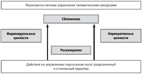 Постановка управления человеческими ресурсами в формате системного подхода с учетом организационной культуры положительно влияет на организационную культуру. Происходит, например, сближение корпоративных и индивидуальных ценностей (рис. 5.4.2). Это сближение обусловлено заметным улучшением межличностных и межгрупповых взаимодействий. Например, существенно снижается опасность возникновения чувства несправедливости вознаграждения, повышается объективность оценки результатов труда и контроля, следовательно, ослабляется конфликтогенность в коллективах. Сотрудники отмечают, что им стали более понятны и цели, и логика действий партнеров. Переход к деятельности, основанной на формализованных процедурах, т. е. понятных и однозначных «правилах игры», привязка базовых регламентов к миссии и стратегиям компании на рациональном уровне обосновывает новые требования к поведению. Сближение индивидуальных и корпоративных ценностей происходит тем быстрее, чем активнее привлекается персонал к проектным работам. Вовлечение работников рождает в них чувство сопричастности к созданию законов собственной производственной жизни, помогает глубже осознать смысл своих и корпоративных действий.