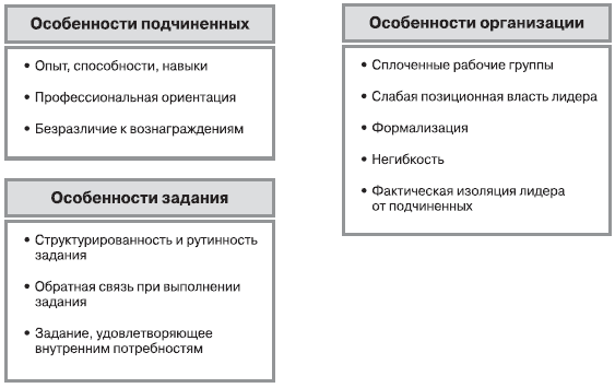 – И наконец, может быть, главный довод – есть другие решения, которые замечательным образом компенсируют отсутствие лидеров. Их назвали заменителями лидерства. На рисунке 5.4.5 представлены три группы таких заменителей (адаптировано по С. Керру и М. Джерминеру ): особенности подчиненных, особенности задания, особенности организации. К последней группе заменителей, помимо того что изображено на рисунке, добавим два положения – корпоративная архитектура и система управления человеческими ресурсами.