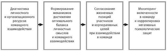 На наш взгляд, к работе по формированию команд полезно привлекать внешних специалистов, которые должны работать одновременно и в индивидуальном, и в групповом форматах. На рисунке 5.4.7 обозначены основные направления консультационной поддержки командообразования. Ниже представлено содержание работ в каждом из направлений.