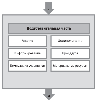 Нужно выявить распространенные в компании типы организационных коммуникаций (цепочка, звездочка, колесо, круг, Y). Каждый из этих типов имеет свои плюсы и минусы. Поскольку палитра типов в компании может быть весьма разнообразной, нужно их подстроить под корпоративные задачи и специфику, т. е. внести в стандарты, регламентирующие проведения совещаний и других форм организационной коммуникации описания необходимого типа.Рис. 5.4.10. Логика подготовки совещаний