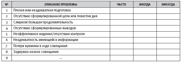 Опыт показывает, что в большинстве компаний не знают, какое количество совещаний и каких видов проводится в компании, каковы затраты на их подготовку и проведение во временных и стоимостных показателях и, наконец, какова их эффективность. Между тем это легко сделать даже получением простой обратной связи от участников совещания (конечно, при условии гарантий «ненаказания» за критику). В таблице 5.4.1 приведен фрагмент анкеты оценки совещания, с помощью которой можно выявить наиболее типичные процедурные недостатки совещаний.Таблица 5.4.1. Фрагмент анкеты оценки процедурных ограничений совещаний