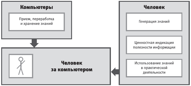 На рисунке 6.3.2 представлена общая схема соотношения возможностей компьютерных систем и человека в управлении знаниями.