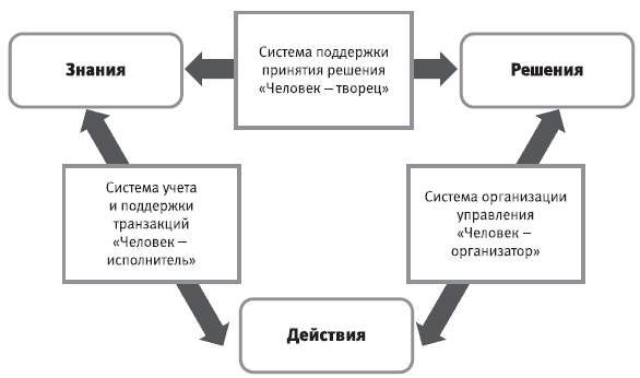 Только интеграция человека с компьютером, но никак не подмена одного другим, может создать реальные условия для революционного прорыва в управленческих решениях.Рис. 6.3.3. Человек и информационные системы в триаде «знания – решения – действия»