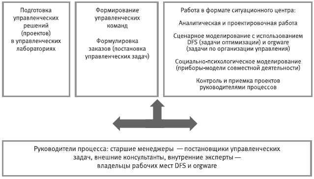 Постановку задач (формулировку заданий) осуществляют руководители процесса, конкретный состав которых определяется в зависимости от подготовленности тех или иных сотрудников, от наличия внешних консультантов. Благодаря использованию мощных информационных систем проектные задания как в области организации управления, так и в области оптимизации и прогнозирования выполняются «под ключ» с исключительно высокой точностью и в беспрецедентно короткие сроки. Заметим, что инструменты DFS применяются и в реальном управлении, и при опережающем обучении в качестве «собственных микромиров».