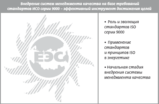 Осуществление перечисленных мероприятий позволяет начать переход к широкомасштабному внедрению СМК в энергокомпаниях холдинга РАО «ЕЭС России». Внедрение в энергокомпаниях СМК на базе требований ISO серии 9000 является мощным средством и инструментом, позволяющим обеспечить реализацию стратегии развития энергетики, нацеленной на решение следующих задач: обеспечение лидирующей роли энергетики в развитии производственно-технического потенциала России; дальнейшее развитие производственного потенциала энергопредприятий; повышение надежности и технико-экономической эффективности энергоснабжения потребителей. Создание эффективных СМК, ориентированных на внедрение современных технологий и методов менеджмента качества, является залогом устойчивого функционирования энергокомпаний холдинга РАО «ЕЭС России». При этом внедрение СМК не ведет к разрушению существующих систем управления, а представляет собой их модернизацию на основе использования мирового опыта и современных методов управления в соответствии с требованиями международных стандартов ISO серии 9000.