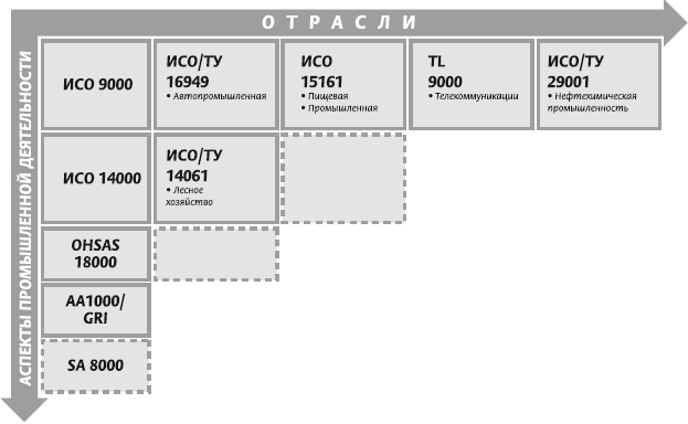 Стандарты ISO развиваются как по отраслям, так и по аспектам деятельности (см. рис. 5.2.1). Для электроэнергетики нет отраслевого стандарта качества (однако не исключено его появление), поэтому энергокомпании разных стран руководствуются универсальным стандартом ISO серии 9000.