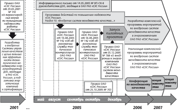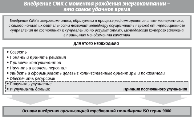 Безусловно, электроэнергетика России, в которой назрела острая необходимость внедрения системы менеджмента качества (см. рис. 5.3.1) в соответствии со всемирно признанными стандартами ISO серии 9000, не могла и не должна была стоять в стороне от практического внедрения подобных инноваций в управлении энергокомпаниями. Завершение в 2005 г. основных этапов структурной фазы реформирования энергокомпаний ОАО РАО «ЕЭС России» создало наиболее благоприятные условия для разворачивания целенаправленной работы по внедрению СМК (рис. 5.3.1). Задача внедрения СМК в энергокомпаниях ОАО РАО «ЕЭС России» в соответствии с требованиями стандартов ISO серии 9000 была сформулирована в «Программе действий по повышению надежности работы ЕЭС России», утвержденной Правлением ОАО РАО «ЕЭС России». Началу широкого внедрения СМК в холдинге РАО «ЕЭС России» предшествовали подготовительные мероприятия: