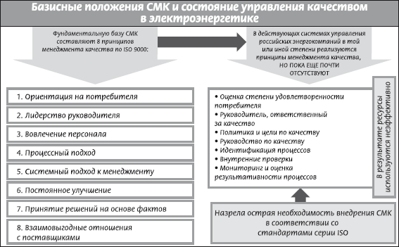 Системы менеджмента качества являются частью общих систем управления энергокомпаний и их предприятий и представляют собой совокупность взаимосвязанных и взаимодействующих производственно-хозяйственных и управленческих процессов, основанных на соответствующих принципах. На рисунке 5.4.1 показаны основные принципы СМК по международным стандартам ISO серии 9000 и то, как состояние управления качеством в энергокомпаниях ОАО РАО «ЕЭС России» соотносится с базисными принципами СМК.