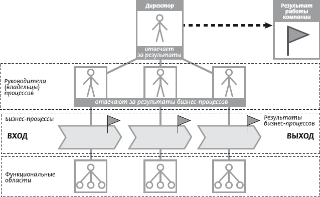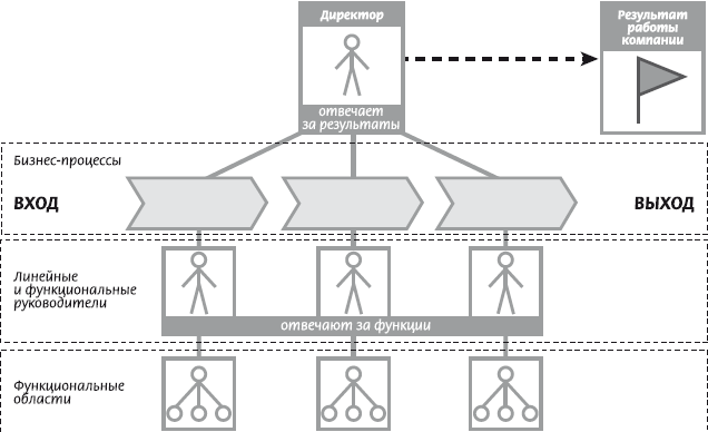 При модели управления , ориентированной на регламентацию работ через функции (функционально ориентированная модель управления) , единственным «владельцем» по терминологии ISO всех процессов в компании является ее «первое лицо»: генеральный директор единолично отвечает за «выход» и показатели результативности деятельности компании. Руководители более низкого ранга отвечают за исполнение функций, а не за БП (см. рис. 3.1.2). Они не отвечают за работу от начала до конца, формально говоря, для них работа попросту не определена (им не сообщают, где начало и где конец БП).К концу 80-х гг. XX в. «давление» потребителей на производителей продукции (поставщиков услуг) усилилось, потребители стали значительно больше влиять на то, что производить, где и как продавать. В борьбе за долю рынка конкурентные преимущества компаний во все большей степени стали обеспечиваться такими характеристиками, как «высокое качество товаров» и «новые маркетинговые стратегии». Однако гарантировать высокое качество продукции массового производства в условиях глобализации и высокой динамики внешней среды можно только при строгой стандартизации деятельности, при одновременном повышении гибкости управления и расширении возможностей для проведения постоянных изменений.