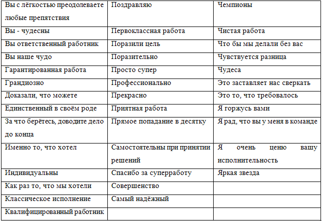 Таблица 3.1. Варианты благодарностей и похвалы за хорошую работу